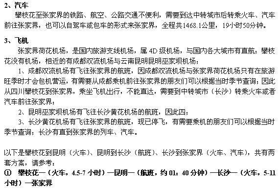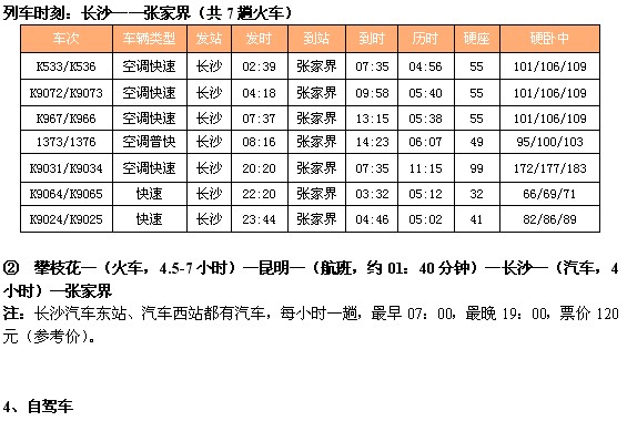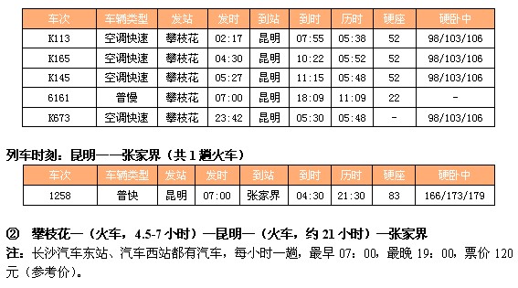 ① 攀枝花—(火车,4.5-7小时)—昆明—(火车,约21小时)—张家界