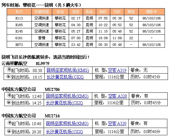 列车时刻:攀枝花——昆明(共5趟火车)