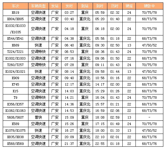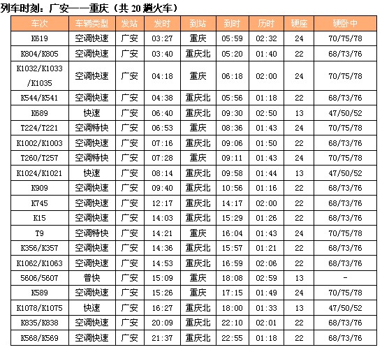 列车时刻:广安——重庆(共20趟火车)