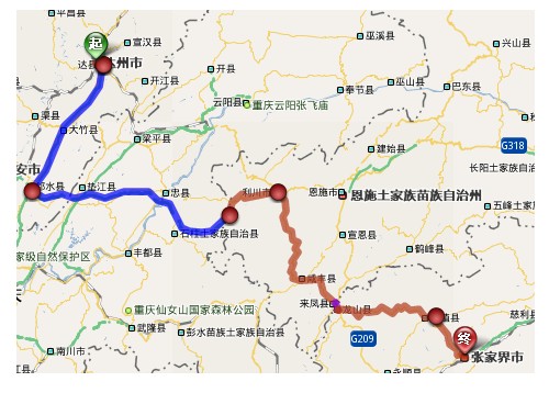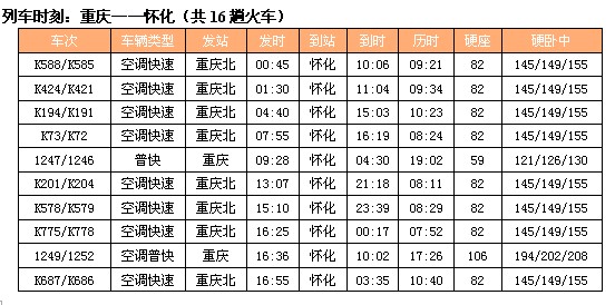 以下是达州至重庆(火车)、重庆到怀化(火车)、怀化到张家界(火车),共有一套方案,请参考: