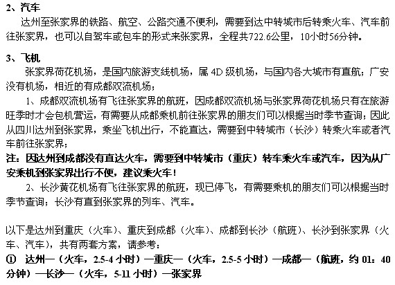 ① 达州—(火车,2.5-4小时)—重庆—(火车,约8-19小时)—怀化—(火车,5-11小时)—张家界