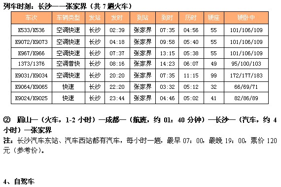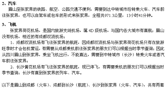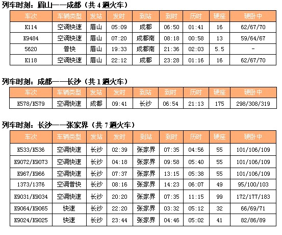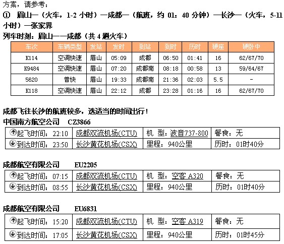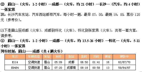 以下是眉山至成都、成都到长沙(火车)、长沙到张家界(火车、汽车),共有两套方案,请参考: