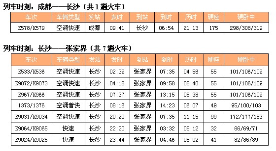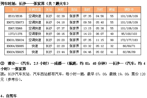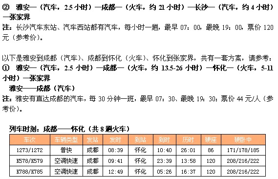 以下是雅安到成都(汽车)、成都到长沙(火车)、长沙到张家界,共有两套方案,请参考: