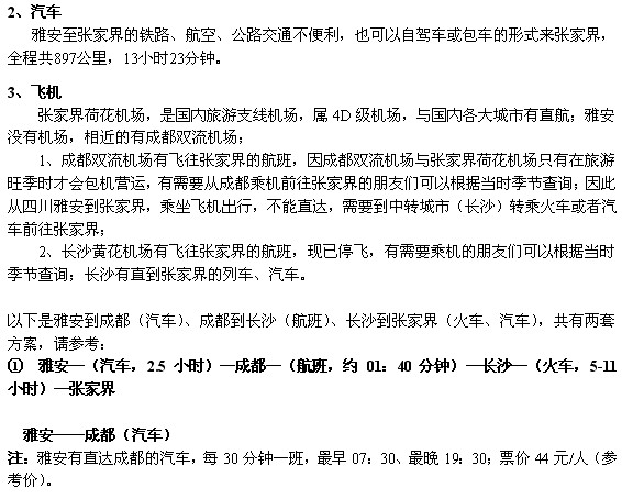 ① 雅安—(汽车,2.5小时)—成都—(火车,约21小时)—长沙—(火车,5-11小时)—张家界