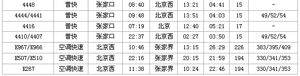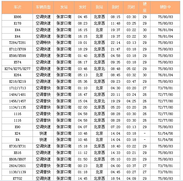 列车时刻:张家口—北京—张家界