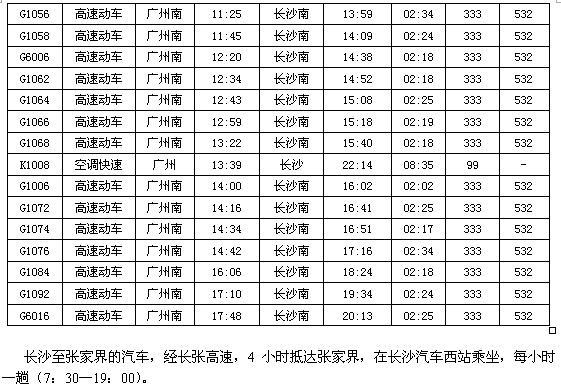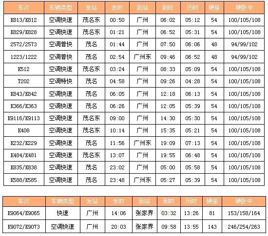 列车时刻:茂名—广州(共14趟火车)—张家界(共7趟火车)