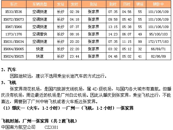 (1)肇庆—(火车,1-2小时)—广州(火车,13-14小时)—张家界
