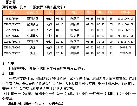 (1)潮州—(火车,6-7小时)—广州—(火车,13-14小时)—张家界