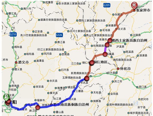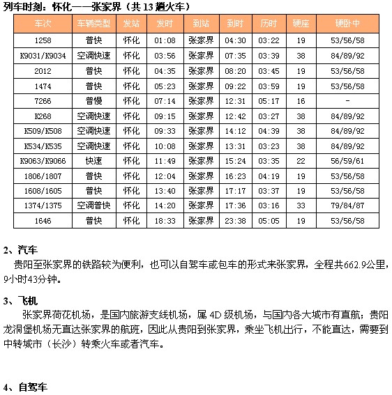② 贵阳—(火车,6-8小时)—怀化—(火车,3-5小时)—张家界