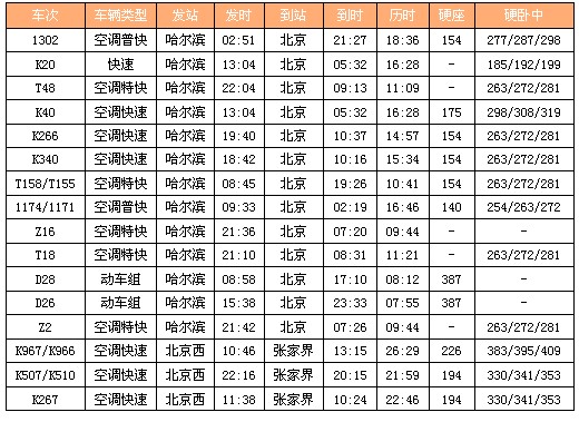 以下是哈尔滨到北京,转车至张家界的车次,请参考: