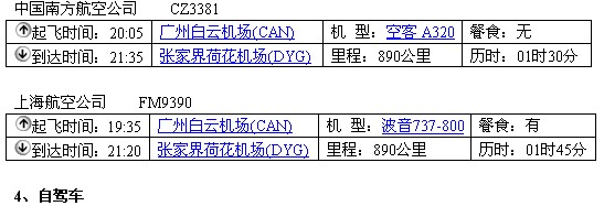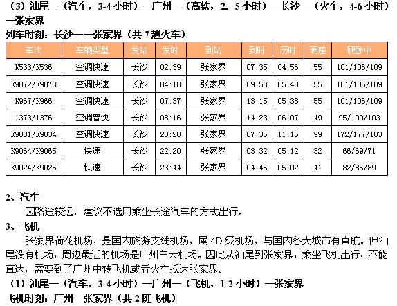(1)汕尾—(汽车,3-4小时)—广州(火车,13-14小时)—张家界
