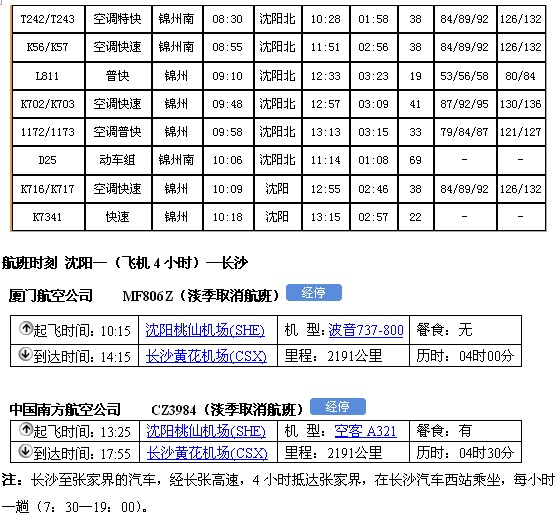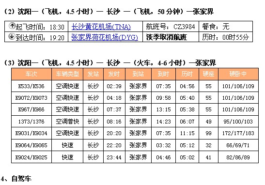 (1)锦州—(火车或汽车)——沈阳—(飞机)— 长沙 —(汽车)—张家界