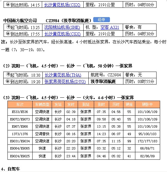 (1)沈阳—(飞机,4.5小时)— 长沙 —(汽车,4小时)—张家界
