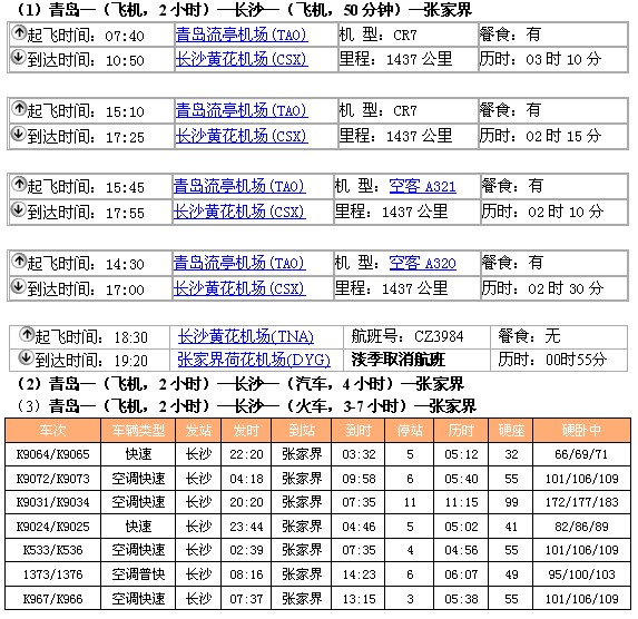 (2)青岛—(火车,5-13小时)—长沙—(汽车,4小时)—张家界