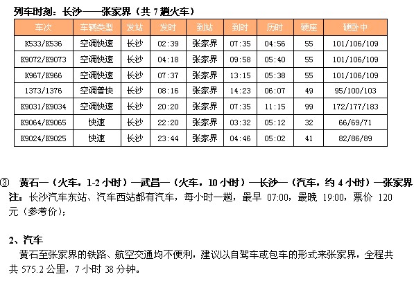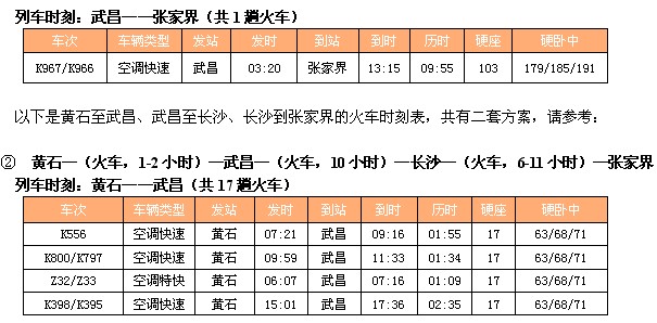① 黄石—(火车,1-2小时)—武昌—(火车,10小时)—张家界