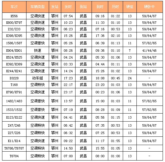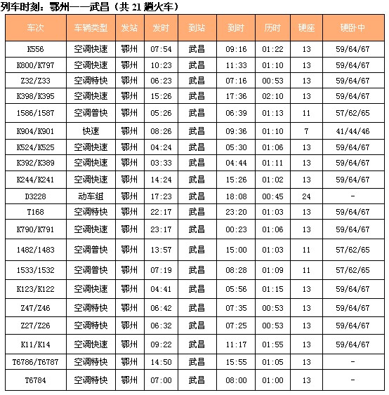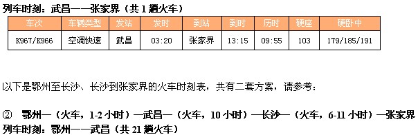 以下是鄂州到武昌、武昌到张家界的火车时刻表,共有一套方案,请参考: