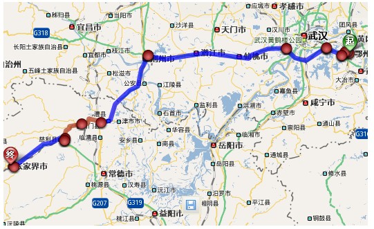 6、沿汉宜高速/沪渝高速行驶180.3公里,从荆州/常德/荆门/襄樊/荆州(中)/襄荆高速出口离开,朝荆州/常德方向,进入襄荆高速