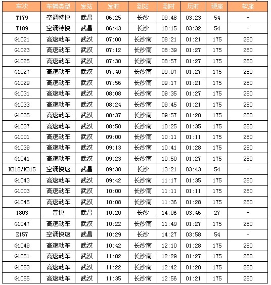 列车时刻:武昌——长沙(建议乘列车共有45趟火车)