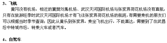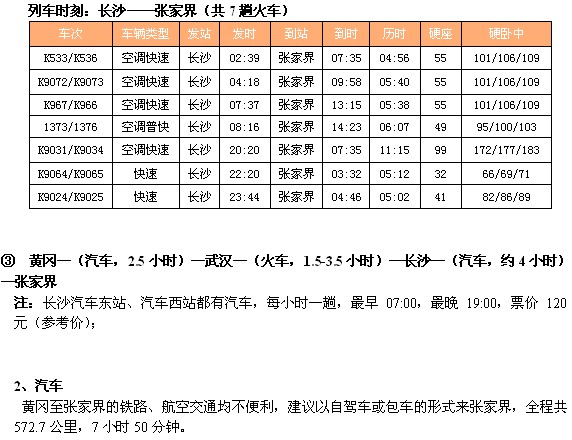 ② 黄冈—(汽车,2.5小时)武汉—(火车,1.5-3.5小时)—长沙—(火车,6-11小时)—张家界