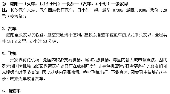 ① 咸宁—(火车,1-3.5小时)—长沙—(火车,10小时)—张家界