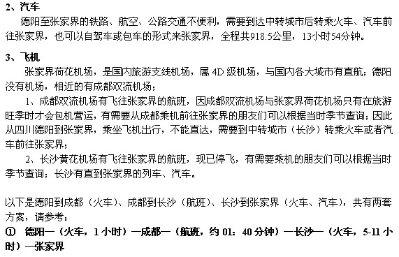 以下是德阳至成都、成都到长沙(火车)、长沙到张家界(火车、汽车),共有两套方案,请参考: