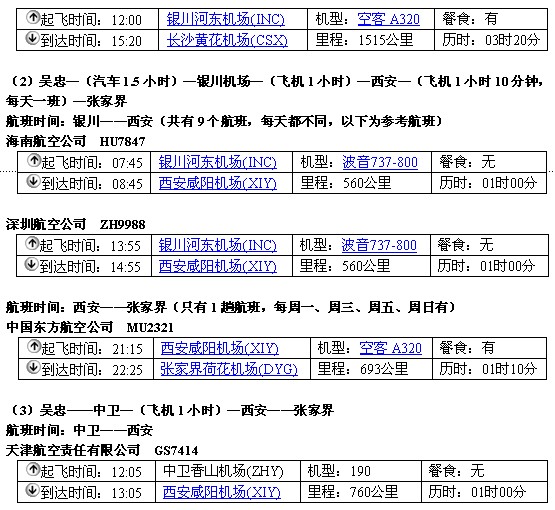 (1)吴忠—(汽车1.5小时)—银川机场—(飞机3小时20分,每周一、周三、周五、周日有航班)—长沙—(火车5-11小时、汽车全程高速4个小时)—张家界
